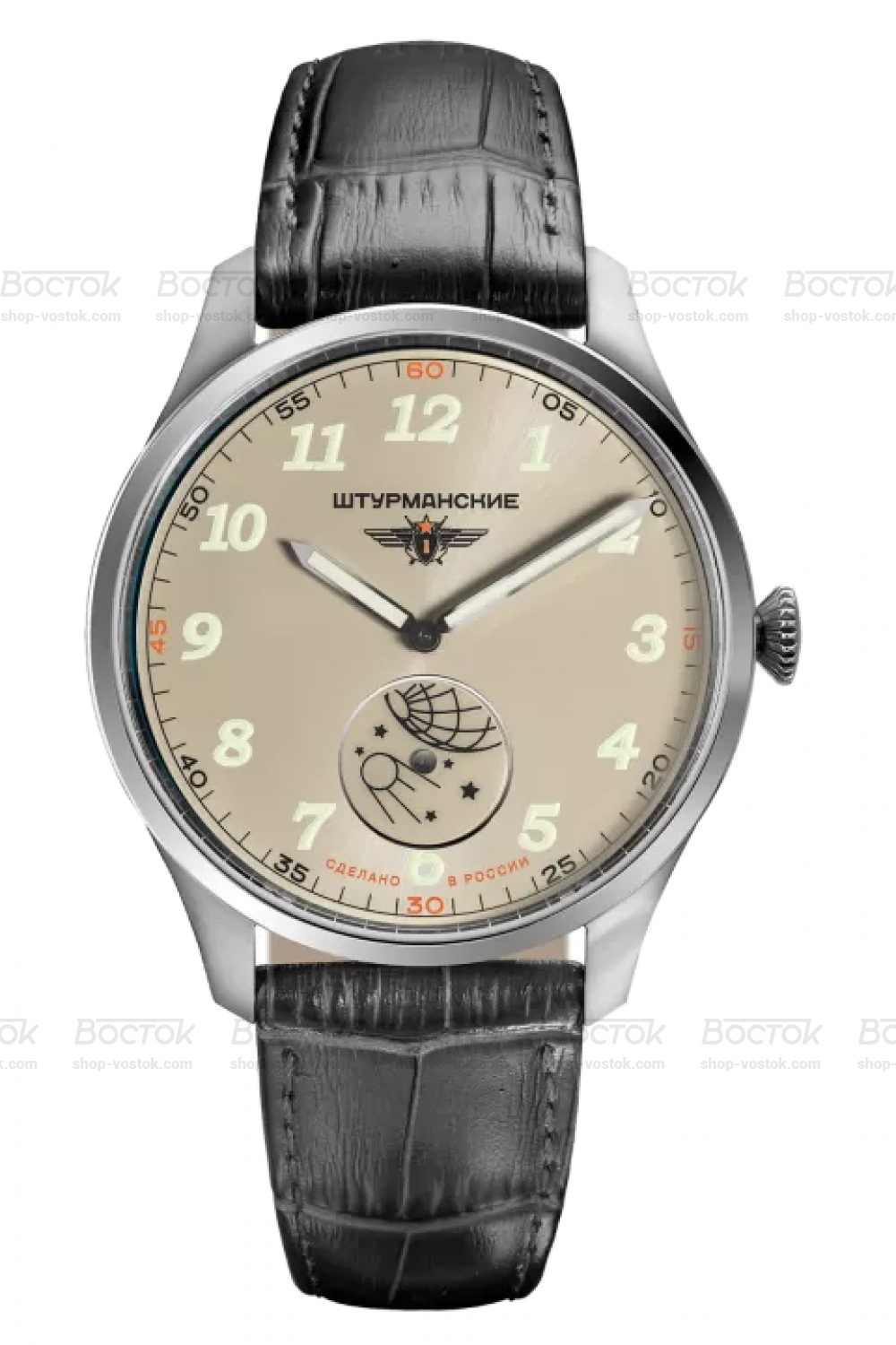 Запуск на орбиту Земли первого искусственного спутника стал настоящим прорывом в освоении космоса. Штурманские увековечили это революционное событие в специальной коллекции. Часы Спутник Наследие Малая Секунда выводят понятия красоты, надежности и функциональности на новый, ранее недостижимый уровень. Часы выглядят строго и в то же время стильно и элегантно. Циферблат закрыт выпуклым минеральным стеклом. Темно-синий кожаный ремешок комфортно облегает руку и перекликается по цвету с циферблатом. Люминесцентные индексы видны даже в темноте. Внутри стального корпуса спрятан японский кварцевый механизм VD78 Seiko, который работает от батарейки и отличается погрешностью в ходе не более 10-20 секунд в месяц. Часы защищены от влаги. Особую оригинальность модели придает миниатюрный секундный циферблат с изображением спутника.